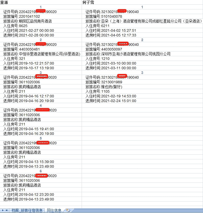 同住记录包括:酒店名称、酒店地址、酒店编号、房号、入住日期(或可能包括具体时间)。