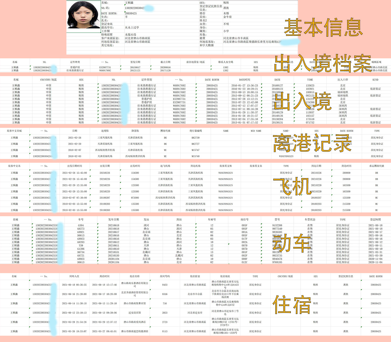 基础资料:身份证头像,姓名,性别,身份证号,民族,生日,生肖,婚姻状况(显示已婚/未婚,不是婚姻记录),星座,血型,籍贯地,身高,最高学历,身份证地址。