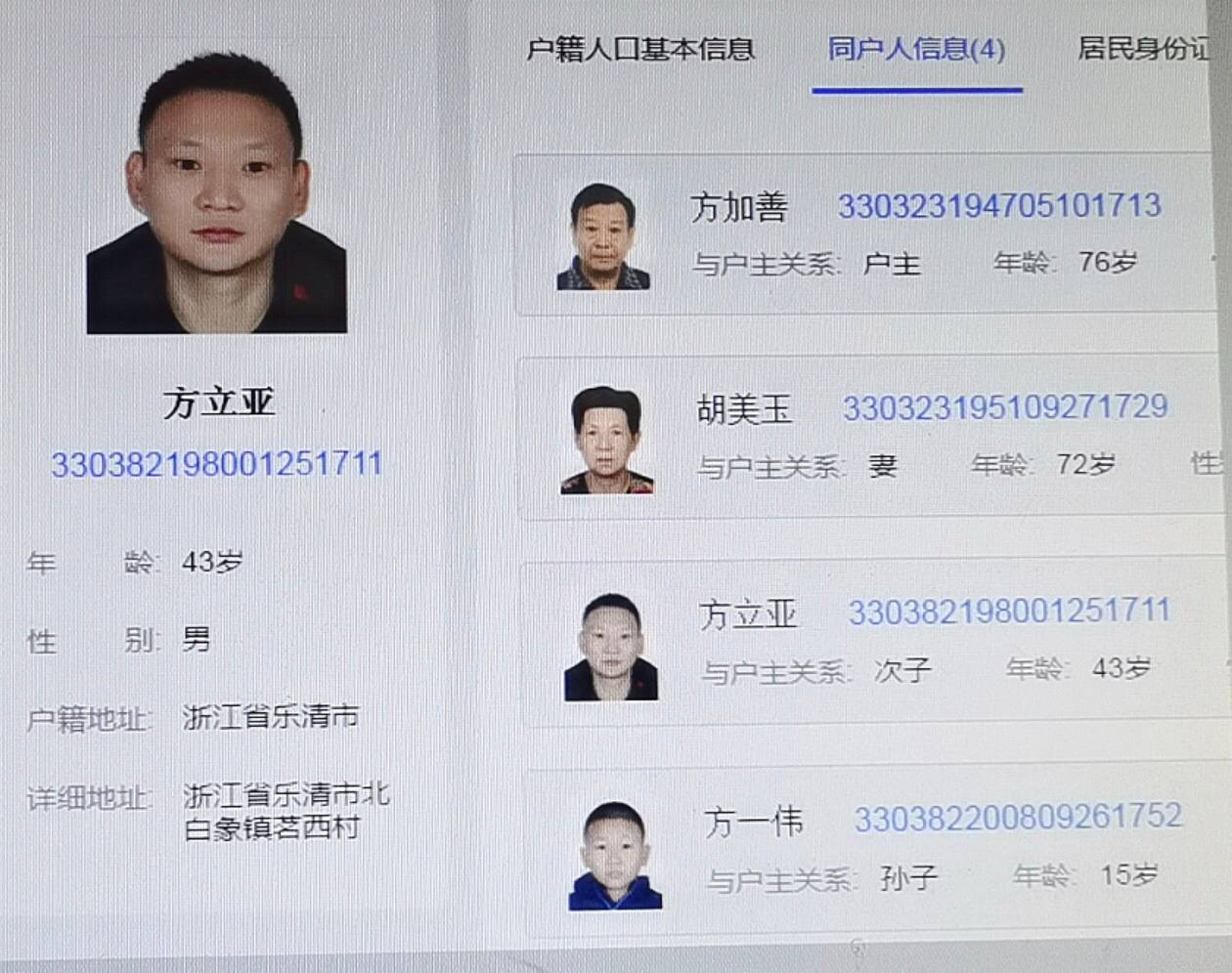 全户即标注有家庭所有成员的那一页,上面的信息有:户主、户籍地址、家庭其他成员的名字、性别、与户主的关系、身份证号、头像。注意,全户里的头像不是高清,如果需要高清图,请再开个户。